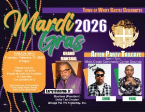 The Town of White Castle is excited to invite residents and visitors to celebrate Mardi Gras 2026 with a full day of tradition, culture, and fun at the Mardi Gras Parade & After Party Tailgate on Tuesday, February 17, 2026.